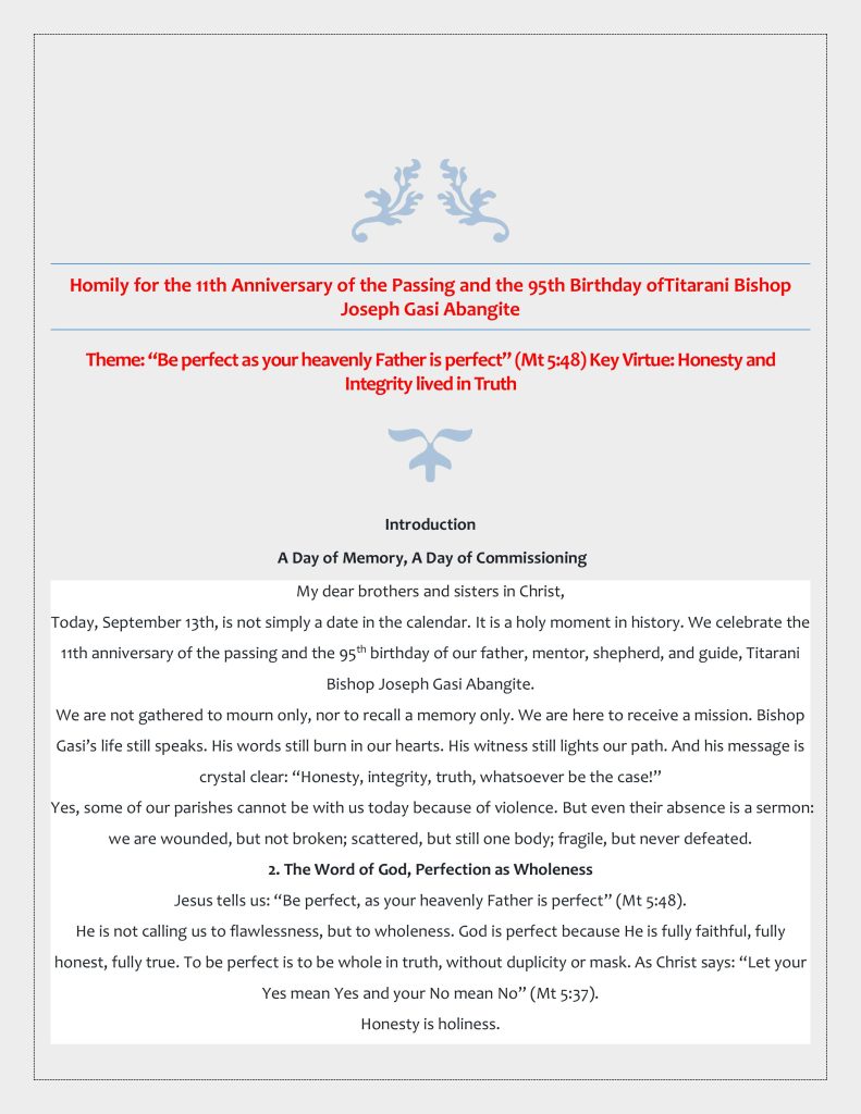 newsHomily for the 11th Anniversary of the Passing and the 95th Birthday of Titarani Bishop Joseph Gasi Abangite Ruru Gene7 months ago7 months ago01 mins Views: 68 Post navigation Previous: CDTY to Establish Diocesan Spiritual Archive in YambioNext: CDTY Announces New Parishes and Initiatives on Anniversary of Bishop Gasi